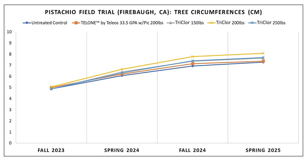 Tree Growth Results: Examining tree circumferences from the Firebaugh site, all soil fumigant treatments promoted stronger growth compared to the untreated control. TriClor at 200 lbs/acre consistently delivered the greatest growth at each time point, resulting in a 12% increase in circumference over untreated trees by Spring 2025. These findings highlight the effectiveness of TriClor, particularly at the 200 lbs/acre rate, in helping young pistachio orchards establish faster and stronger.
