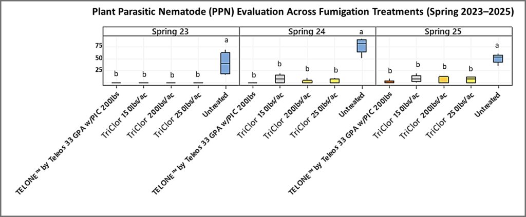 Nematode Results: Assessments of plant-parasitic nematode populations from 2023 through 2025 revealed clear treatment effects. Within the trial site, root lesion, spiral, pin, and stunt nematodes were recovered. In Spring 2023, all soil fumigant treatments provided near-complete suppression, while untreated plots showed very high nematode pressure. By Spring 2024, some rebound was observed in TriClor-treated plots, most notably at 150 and 200 lbs/acre, though populations still remained well below untreated levels. TELONE™ II by Teleos at 33 GPA + TriClor 200 lbs/acre delivered the most consistent suppression across both 2024 and 2025, while TriClor continued to provide strong early-season reductions with partial recovery over time. By Spring 2025, untreated orchards again carried the highest nematode pressure, emphasizing the importance of soil fumigation in protecting young trees from root damage and supporting stronger establishment.